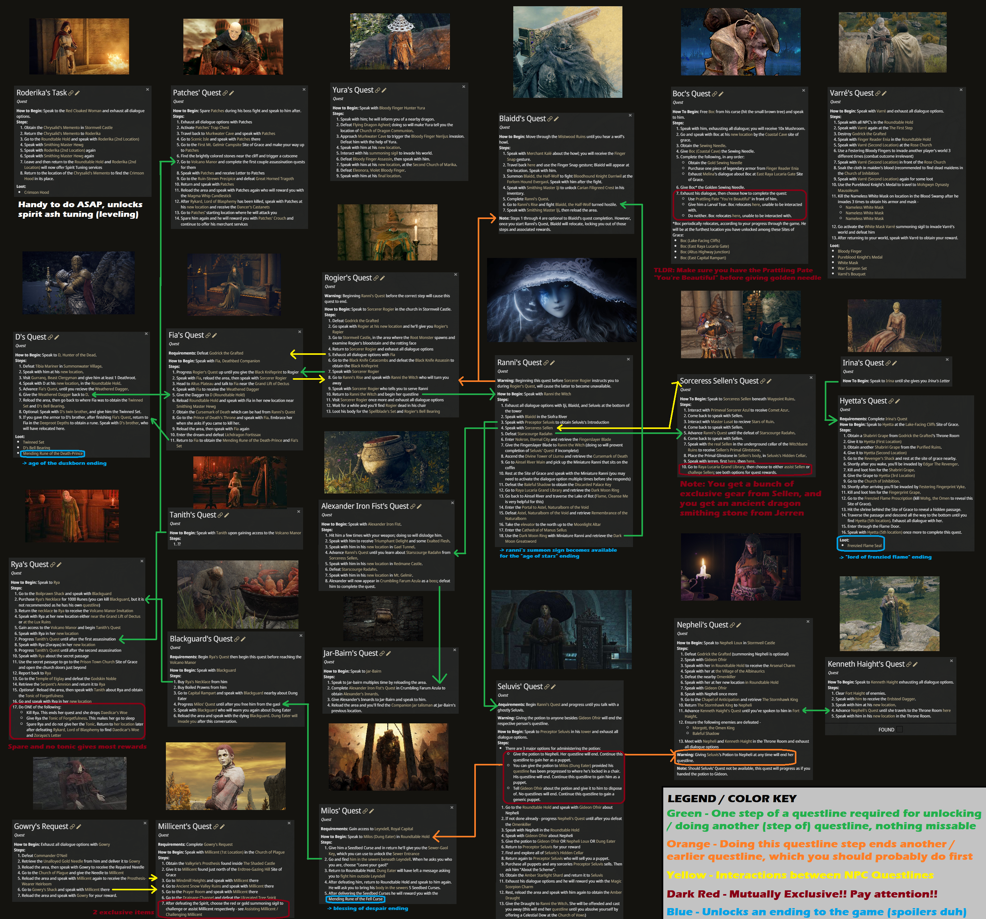 But, in reality, here’s an example of what you have to generate. Fair warning: that’s about a 7 MB image! That’s a visual-based model for testing purposes to go through the questlines. And even that’s really the cliff-notes version. In order to track this kind of stuff, what you really need is the equivalent of a test guide for how you are going to handle testing all of these quest lines. Here’s an example of an Elden Ring Quest Test Strategy.